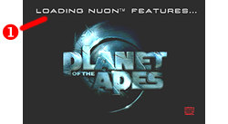 The links and program features undergo extensive testing before being released to the studio for producion. The Planet of the Apes product was tested and released in proper working order but at some point parameters and links were changed before the disc was replicated. Due to currently imposed procedures, VM Labs does not have the ability to effect any changes to the product after submitting the release. We are in the process of trying to alter the procedures so that if an issue is introduced between the time of submission and the discs being replicated, the issues can be corrected. An alert was issued upon receipt of the first replicated disc which immediately revealed the problem, a large number of discs had already been replicated. Although a change will be made to the next replication run, it will be some time before the correct version will become available. The instructions shown below will allow the viewer to access all the NUON special features on the disc. We appologize for the extra effort that is required to access these features. Accessing the NUON Enhanced Features on Planet of the Apes Place the Planet of the Apes disc in your NUON enhanced DVD player. Note: the NUON features can only be accessed from a fresh disc load-- they will not work if accessed after watching the movie or peforming other tasks. When the disc starts loading, you should see the following screen (1). If you do not see "Loading NUON Features" screen, consult your player's user manual for help setting your player to "NUON Mode".